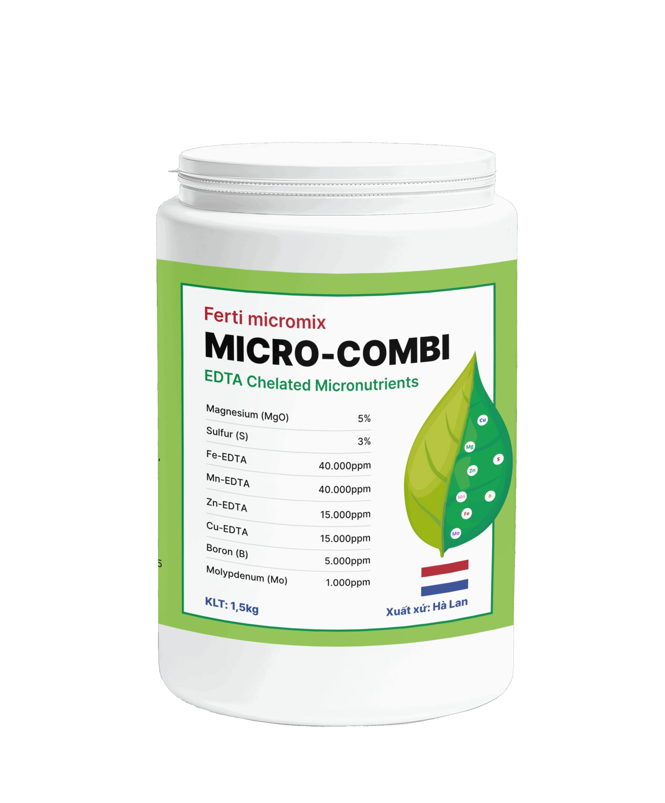 MICRO COMBI – Bổ sung trung vi lượng chelate 8 thành phần hoàn chỉnh, xanh bền bộ lá, chắc khỏe mùa vụ MICROCOMBI là sản phẩm phân bón lá vi lượng cao cấp đến từ Hà Lan thương hiệu nổi tiếng tại Châu Âu với công nghệ Chelate EDTA hiện đại nhất thế giới. Sản phẩm cung cấp 8 thành phần vi lượng thiết yếu dưới dạng Chelate EDTA bền vững, giúp cây trồng hấp thu tối ưu, phục hồi nhanh, chống vàng lá, xoắn lá, còi cọc do thiếu vi lượng. Sản xuất theo tiêu chuẩn chất lượng Châu Âu ISO 9001:2015 và ISO 14001:2015, microcombi cam kết an toàn tuyệt đối cho cây trồng và thân thiện với môi trường.