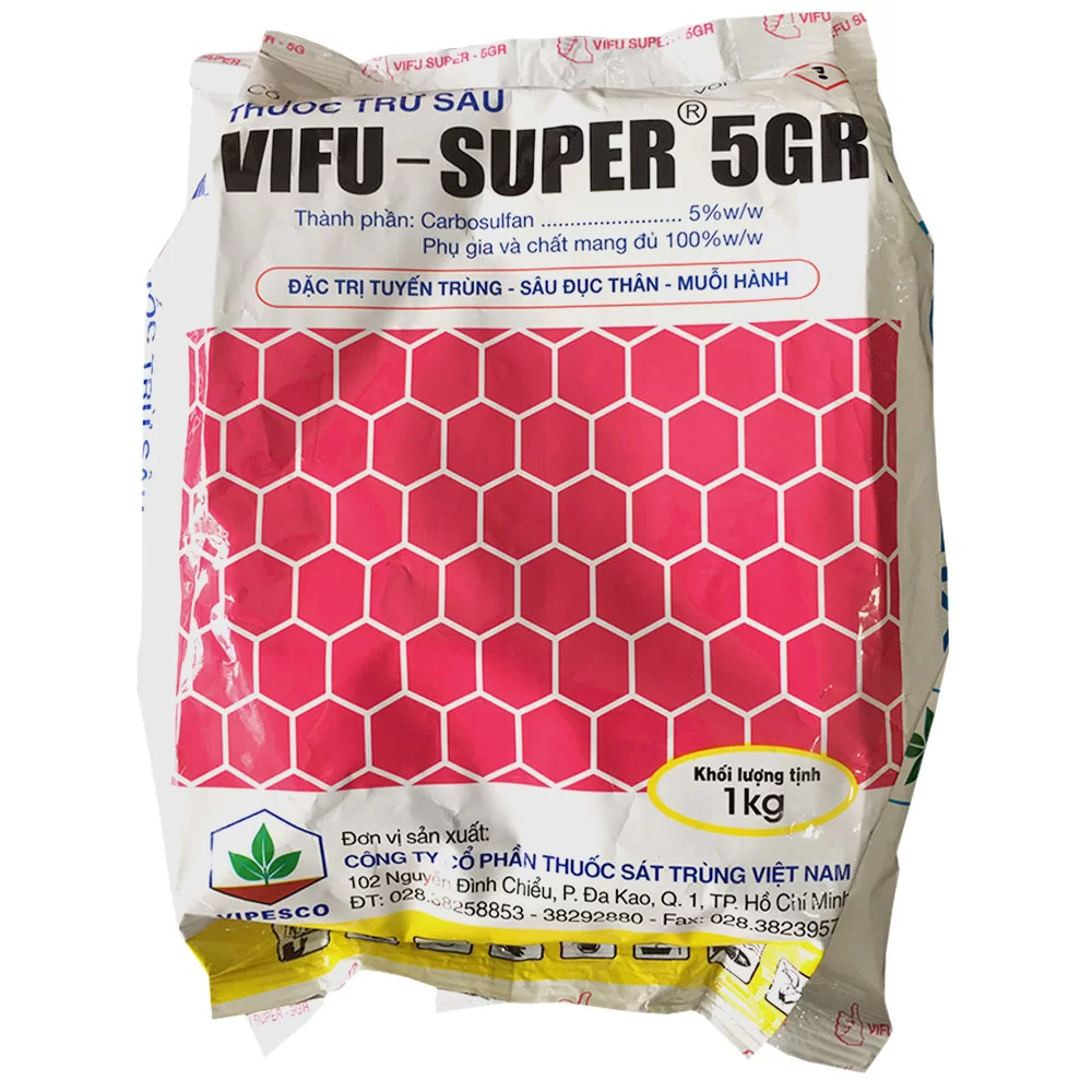 1. Vifu Super 5GR: Đặc trị sùng đất, tuyến trùng, sâu đục thân, muỗi hành,…trên nhiều cây trồng.